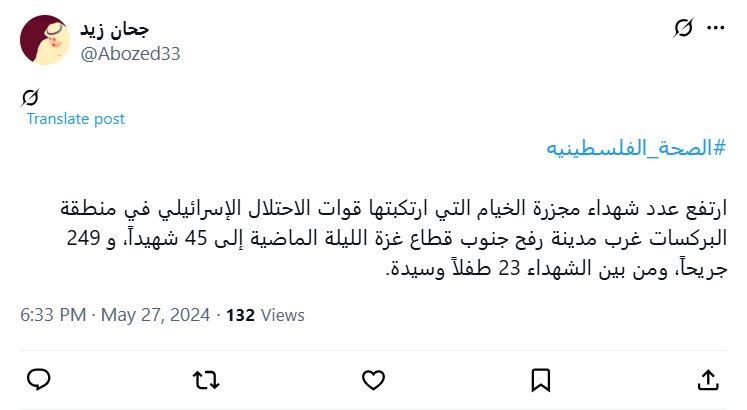 ارتفع عدد شهداء مجزرة الخيام التي ارتكبتها قوات الاحتلال الإسرائيلي في منطقة البركسات غرب مدينة رفح جنوب قطاع غزة الليلة الماضية إلى 45 شهيداً، و 249 جريحاً، ومن بين الشهداء 23 طفلاً وسيدة.