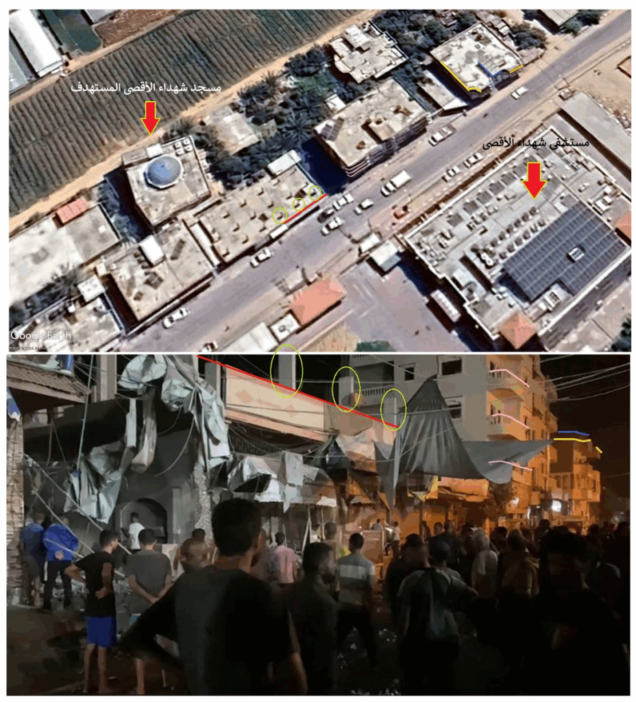 تحديد مكاني لاستهداف اسرائيلي على مسجد شهداء الأقصى مقابل مستشفى شهداء الأقصى، دير البلح.