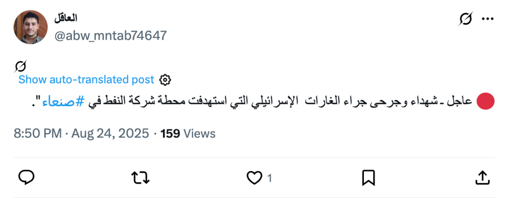 عاجل ـ شهداء وجرحى جراء الغارات الإسرائيلي التي استهدفت محطة شركة النفط في #صنعاء ".