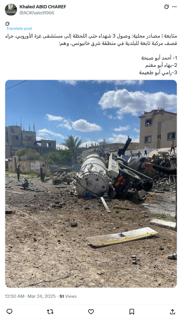Follow-up | Local sources: 3 martyrs have arrived so far at the Gaza European Hospital, as a result of the bombing of a municipal vehicle in the eastern Khan Yunis area. They are: 1- Ahmed Abu Subha 2- Bahaa Abu Mughnim 3- Rami Abu Taima