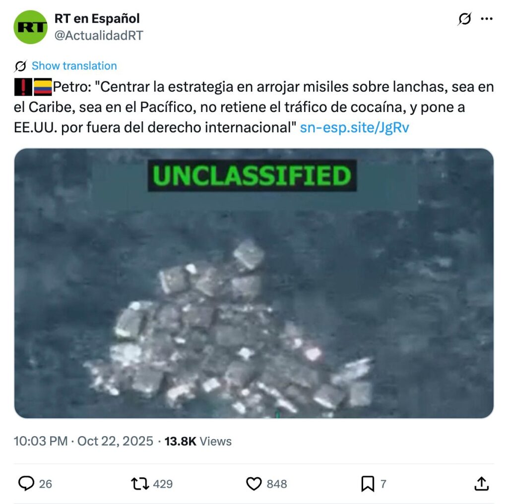 Petro: "Focusing the strategy on launching missiles at boats, whether in the Caribbean or the Pacific, does not stop cocaine trafficking, and puts the U.S. outside of international law" https://sn-esp.site/JgRv