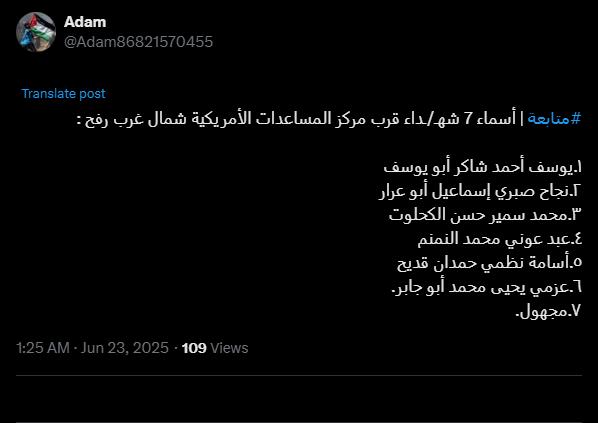 #Follow-up | Names of 7 martyrs near the American aid center northwest of Rafah: 1. Youssef Ahmed Shaker Abu Youssef 2. Najah Sabry Ismail Abu Arar 3. Muhammad Samir Hassan Al-Kahlout 4. Abdul Awni Muhammad Al-Namnam 5. Osama Nazmi Hamdan Qudaih 6. Azmi Yahya Muhammad Abu Jaber. 7. Unknown.