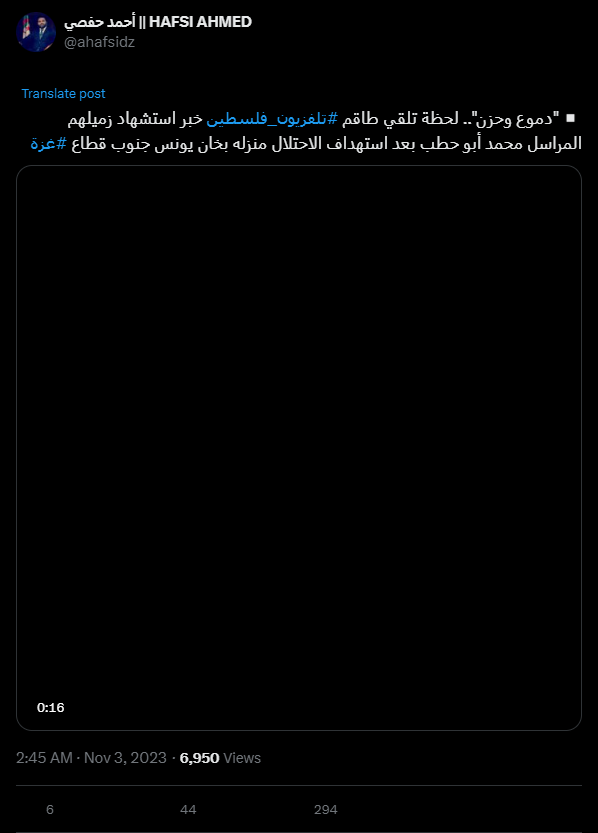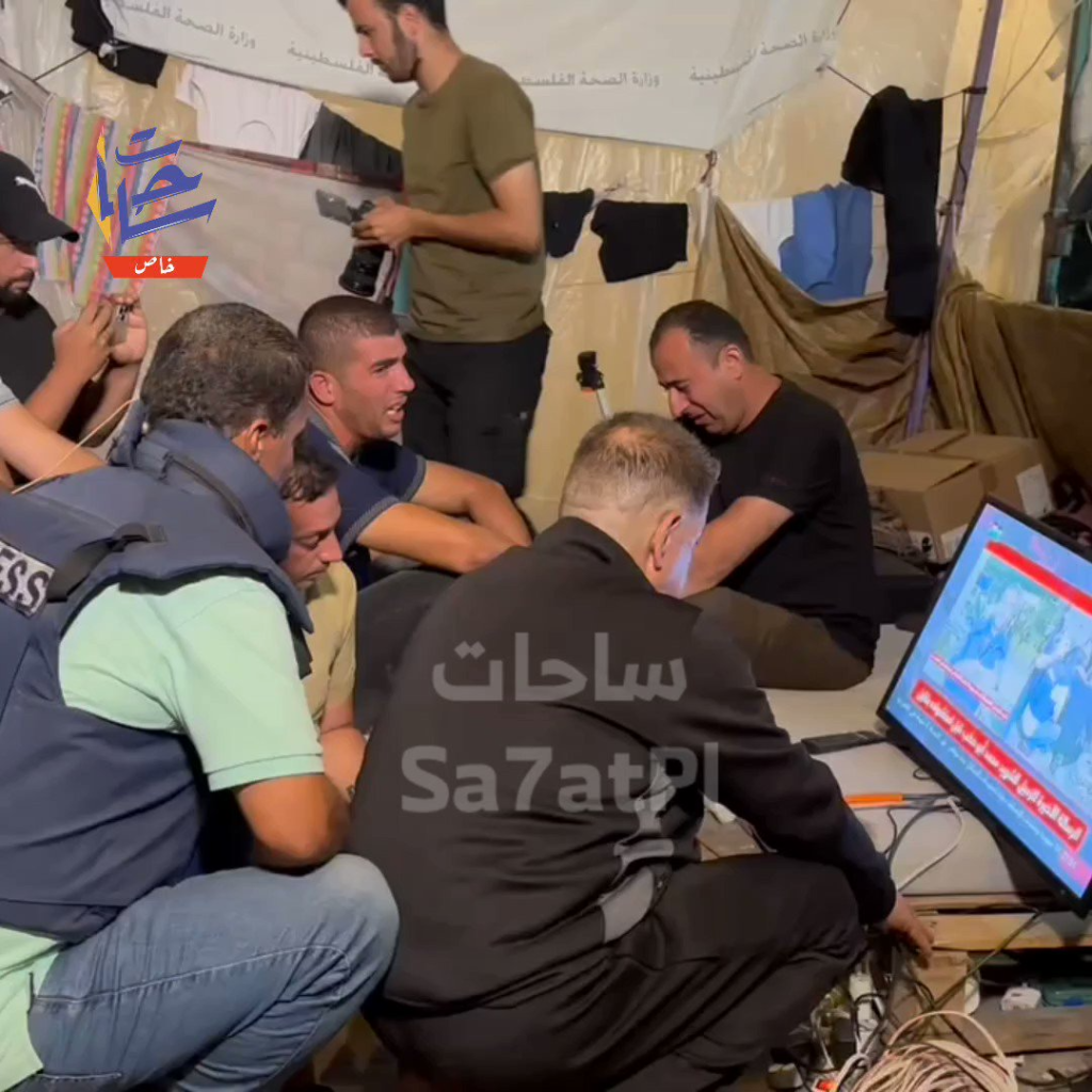 "Tears and sadness"... the moment the #Palestine_TV crew received the news of the martyrdom of their colleague, reporter Mohammed Abu Hatab, after the occupation targeted his home in Khan Yunis, south of the #Gaza Strip.