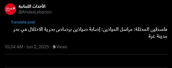 Occupied Palestine: Al-Mayadeen correspondent: Two fishermen were injured by Israeli naval gunfire off the coast of Gaza City.