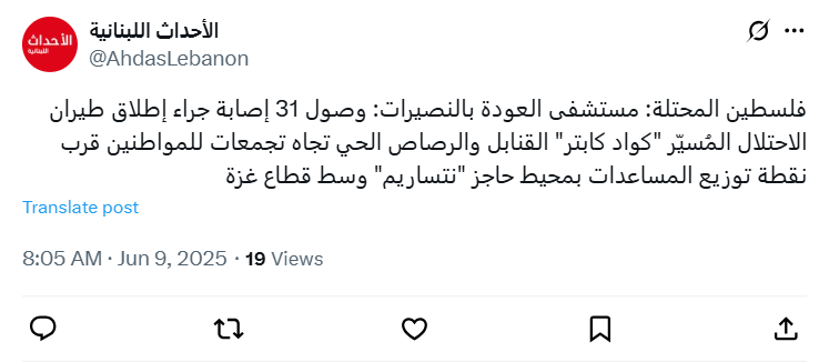 فلسطين المحتلة: مستشفى العودة بالنصيرات: وصول 31 إصابة جراء إطلاق طيران الاحتلال المُسيّر "كواد كابتر" القنابل والرصاص الحي تجاه تجمعات للمواطنين قرب نقطة توزيع المساعدات بمحيط حاجز "نتساريم" وسط قطاع غزة