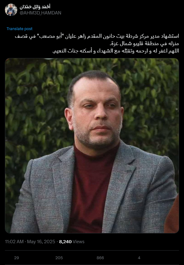 The director of the Beit Hanoun police station, Lieutenant Colonel Zaher Alian "Abu Musab," was martyred when his home in the Qalibu area, north of Gaza, was bombed. May God forgive him, have mercy on him, and accept him among the martyrs and grant him a place in the gardens of paradise.