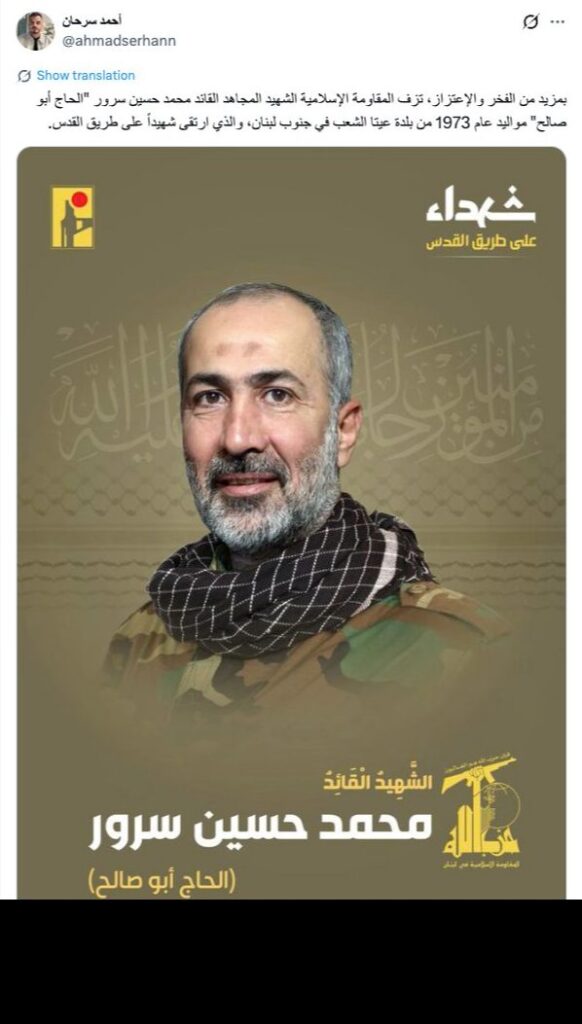 With great pride and honor, the Islamic Resistance announces the martyrdom of the Mujahid Commander Muhammad Hussein Srour “Hajj Abu Saleh”, born in 1973 from the town of Aita al-Shaab in southern Lebanon, who was martyred on the road to Jerusalem.