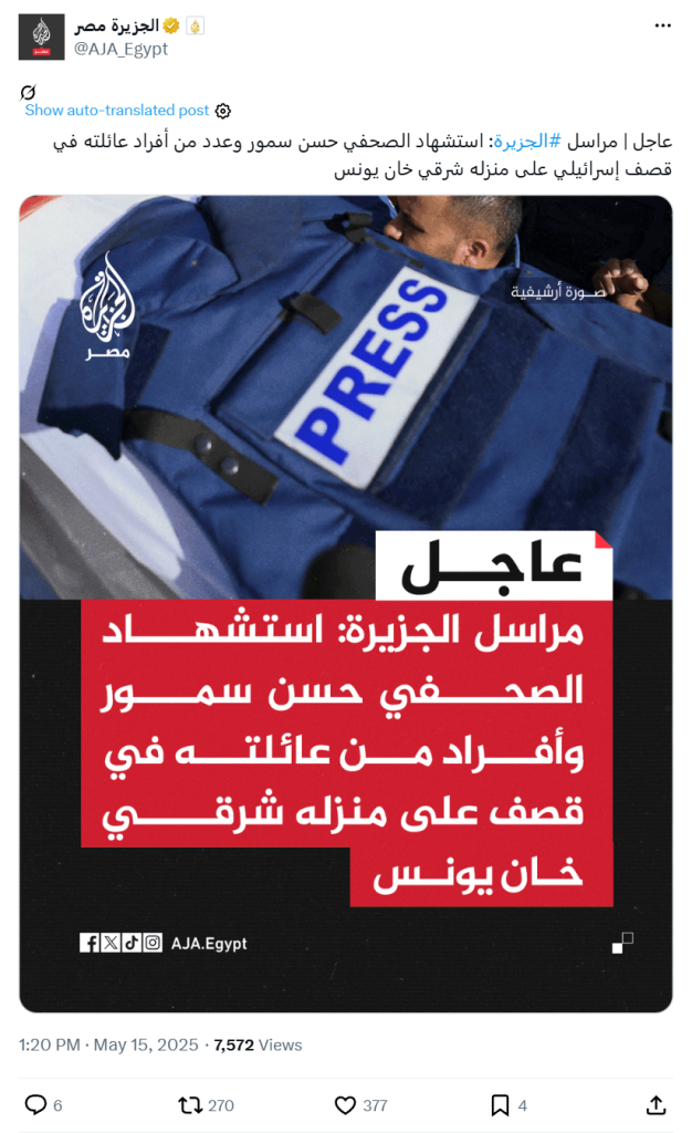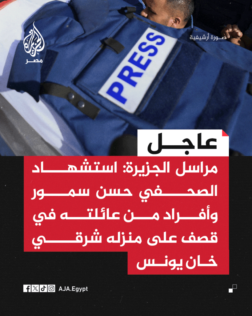 عاجل | مراسل #الجزيرة: استشهاد الصحفي حسن سمور وعدد من أفراد عائلته في قصف إسرائيلي على منزله شرقي خان يونس