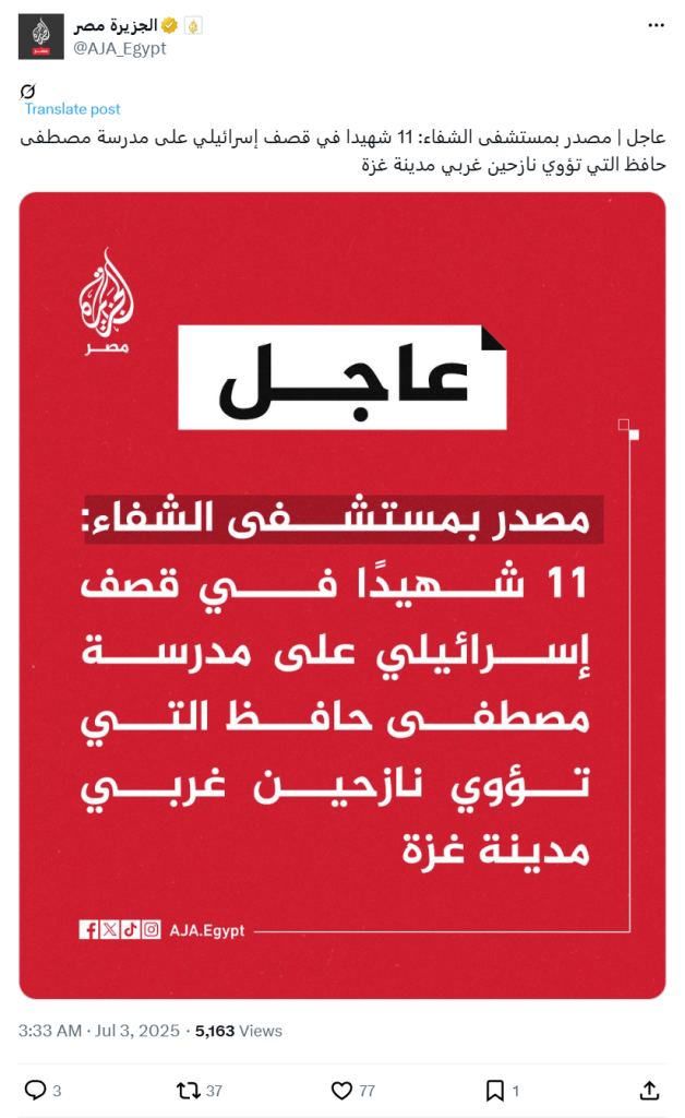 Urgent | Al-Shifa Hospital source: 11 martyrs in Israeli bombing of Mustafa Hafez School, which houses displaced people west of Gaza City.
