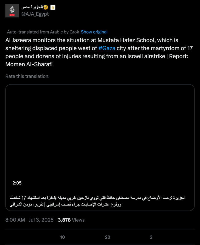 Al Jazeera monitors the situation at Mustafa Hafez School, which is sheltering displaced people west of #Gaza city after the martyrdom of 17 people and dozens of injuries resulting from an Israeli airstrike | Report: Momen Al-Sharafi