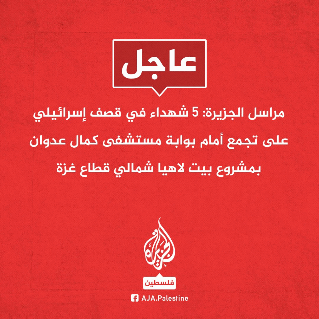 Urgent | #AlJazeera correspondent: - 5 martyrs in an Israeli bombardment on a gathering in front of the gate of Kamal Adwan Hospital in the Beit Lahia project, north of the Gaza Strip - 4 martyrs and a number of wounded and missing in an Israeli bombardment on a house in the Beit Lahia project, north of the Gaza Strip