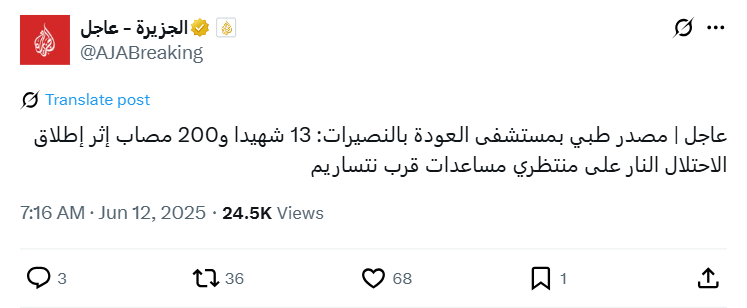 Urgent | A medical source at Al-Awda Hospital in Nuseirat: 13 martyrs and 200 wounded after the occupation forces opened fire on those waiting for aid near Netzarim.