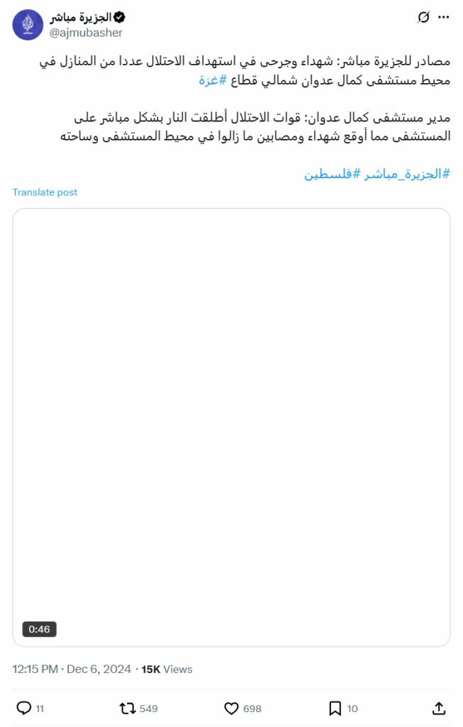 Sources for Al Jazeera Mubasher: Martyrs and wounded as the occupation forces targeted a number of homes in the vicinity of Kamal Adwan Hospital in the northern Gaza Strip. Director of Kamal Adwan Hospital: The occupation forces fired directly at the hospital, resulting in martyrs and wounded who are still in the vicinity of the hospital and its courtyard. #Al Jazeera Mubasher #Palestine