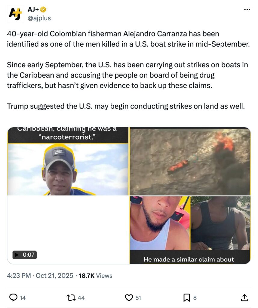 40-year-old Colombian fisherman Alejandro Carranza has been identified as one of the men killed in a U.S. boat strike in mid-September.