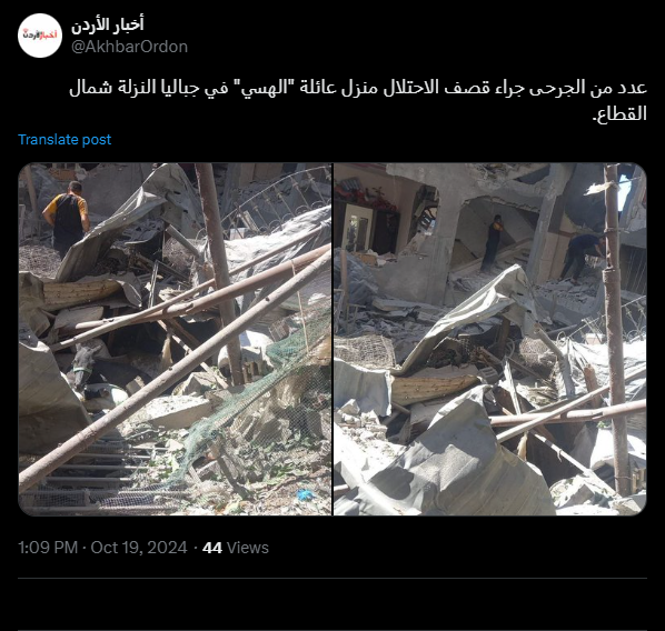 عدد من الجرحى جراء قصف الاحتلال منزل عائلة "الهسي" في جباليا النزلة شمال القطاع.