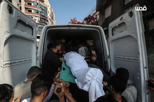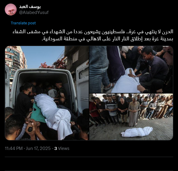 Grief never ends in Gaza. Palestinians bury a number of martyrs at Al-Shifa Hospital in Gaza City after gunfire targeted residents in the Sudanese area.