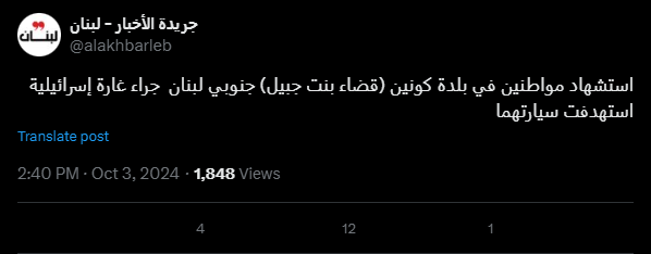 استشهاد مواطنين في بلدة كونين (قضاء بنت جبيل) جنوبي لبنان جراء غارة إسرائيلية استهدفت سيارتهما