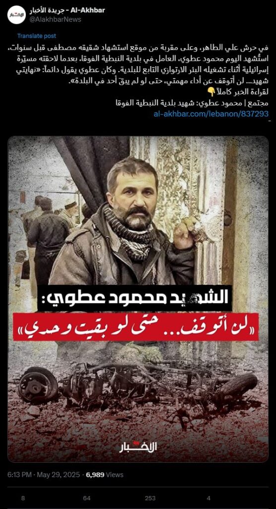 في حرش علي الطاهر، وعلى مقربة من موقع استشهاد شقيقه مصطفى قبل سنوات، استُشهد اليوم محمود عطوي، العامل في بلدية النبطية الفوقا، بعدما لاحقته مسيّرة إسرائيلية أثناء تشغيله البئر الارتوازي التابع للبلدية. وكان عطوي يقول دائماً: «نهايتي شهيد... لن أتوقف عن أداء مهمتي، حتى لو لم يبقَ أحد في البلدة».