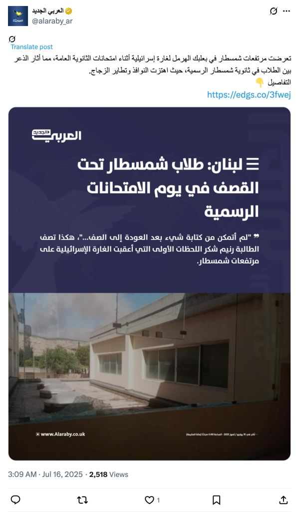 The Shamstar Heights in Baalbek-Hermel were subjected to an Israeli airstrike during high school exams, sparking panic among students at Shamstar Public High School, where windows shook and glass shattered.