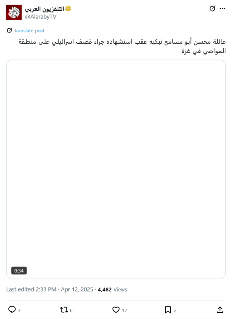 The family of Mohsen Abu Musameh mourns his martyrdom following an Israeli attack on the Al-Mawasi area in Gaza.