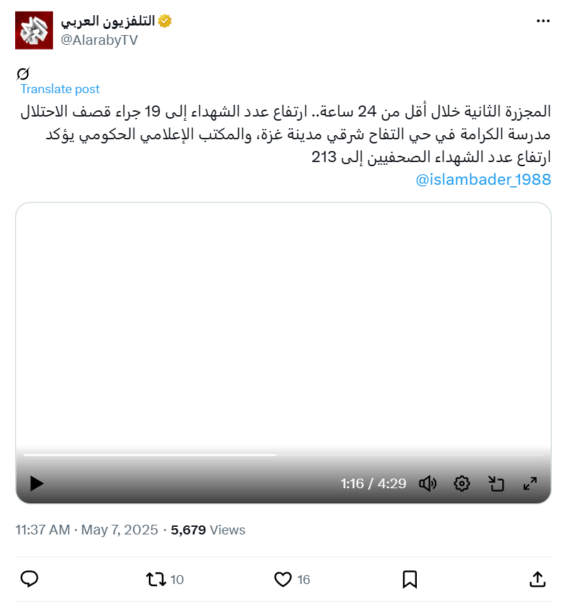 The second massacre in less than 24 hours: The death toll rises to 19 as a result of the occupation's bombing of Al-Karama School in the Al-Tuffah neighborhood east of Gaza City. The Government Media Office confirms that the number of journalist martyrs has risen to 213. @islambader_1988