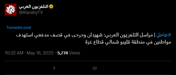 #عاجل | مراسل التلفزيون العربي: شهيدان وجرحى في قصف مدفعي استهدف مواطنين في منطقة قليبو شمالي قطاع غزة