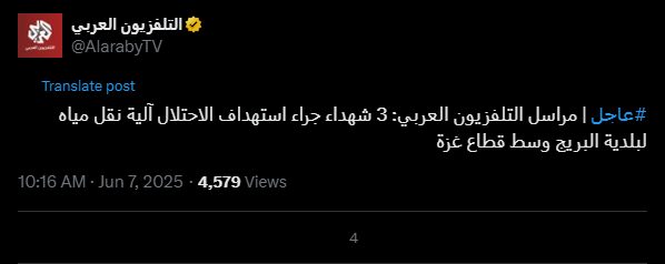 #Urgent | Al-Arabiya TV correspondent: 3 martyrs as a result of the occupation targeting a water tanker for the Al-Bureij municipality in the central Gaza Strip.