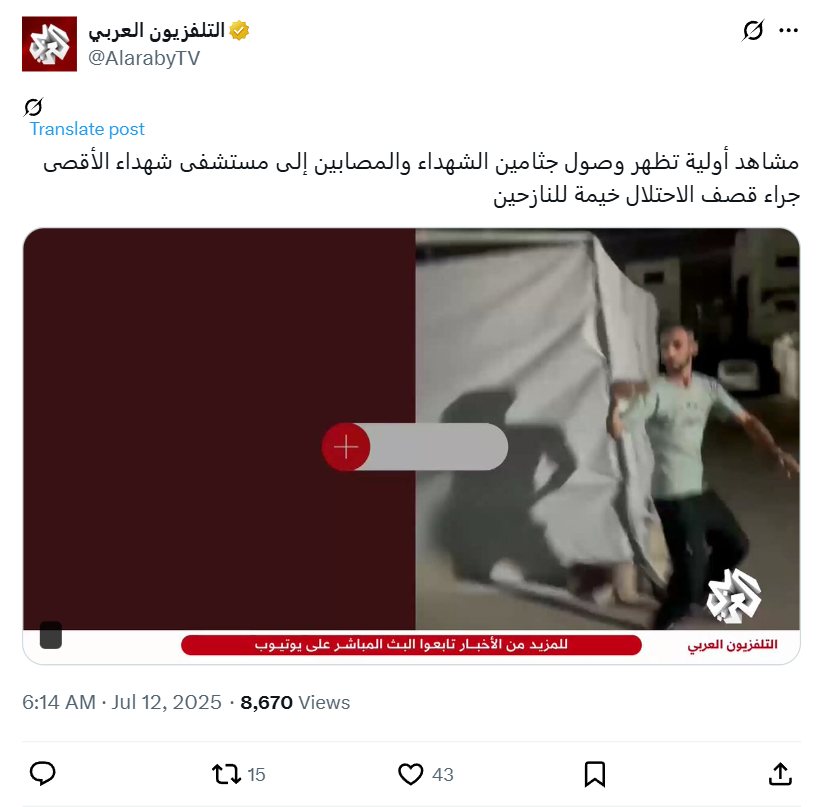 Initial footage shows the bodies of martyrs and wounded arriving at Al-Aqsa Martyrs Hospital after the occupation forces bombed a tent for displaced people.