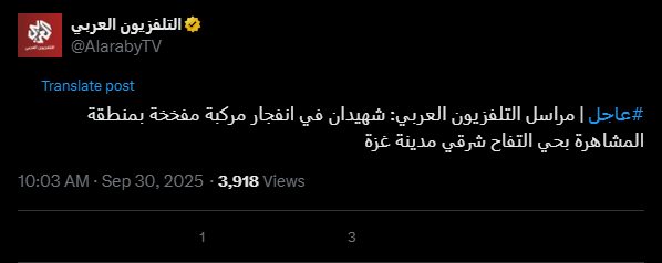#Urgent | Al Arabiya TV correspondent: Two martyrs in a car bomb explosion in the Al-Mashhara area of the Al-Tuffah neighborhood, east of Gaza City.