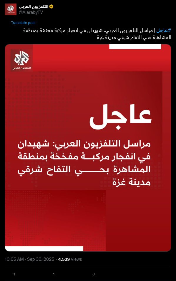 #عاجل | مراسل التلفزيون العربي: شهيدان في انفجار مركبة مفخخة بمنطقة المشاهرة بحي التفاح شرقي مدينة غزة