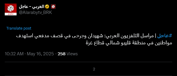 #عاجل | مراسل التلفزيون العربي: شهيدان وجرحى في قصف مدفعي استهدف مواطنين في منطقة قليبو شمالي قطاع غزة
