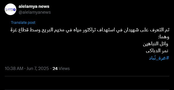 Two martyrs have been identified as a result of the targeting of a water tractor in the Al-Bureij refugee camp in the central Gaza Strip: