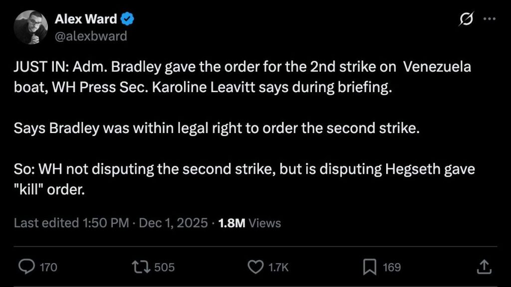 JUST IN: Adm. Bradley gave the order for the 2nd strike on Venezuela boat, WH Press Sec. Karoline Leavitt says during briefing.