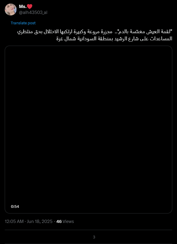 "A livelihood drenched in blood." A horrific and massive massacre committed by the occupation against those waiting for aid on Rashid Street in the Sudanese area, north of Gaza.