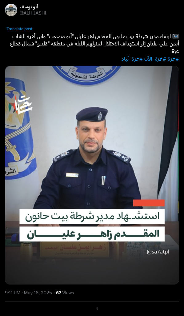 ارتقاء مدير شرطة بيت حانون المقدم زاهر عليان "أبو مصعب" وابن أخيه الشاب أيمن علي عليان إثر استهداف الاحتلال لمنزلهم الليلة في منطقة "قليبو" شمال قطاع غزة