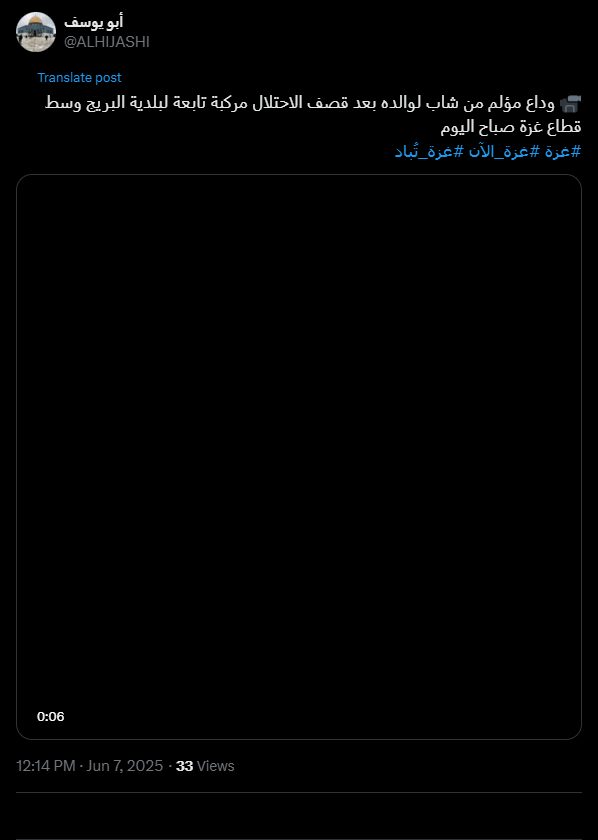 وداع مؤلم من شاب لوالده بعد قصف الاحتلال مركبة تابعة لبلدية البريج وسط قطاع غزة صباح اليوم
