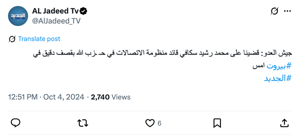 The enemy army: We eliminated Muhammad Rashid Skafi, the commander of Hezbollah's communications system, with a precise bombing in #Beirut yesterday #AlJadeed