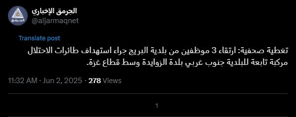 Press coverage: Three employees from the Bureij municipality were killed when Israeli aircraft targeted a municipal vehicle southwest of the town of Az-Zawayda in the central Gaza Strip.