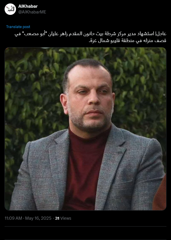 عاجل| استشهاد مدير مركز شرطة بيت حانون المقدم زاهر عليان "أبو مصعب" في قصف منزله في منطقة قليبو شمال غزة.