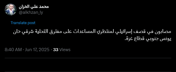 Injured in Israeli shelling of people waiting for aid at the Tahlia junction east of Khan Yunis in the southern Gaza Strip.