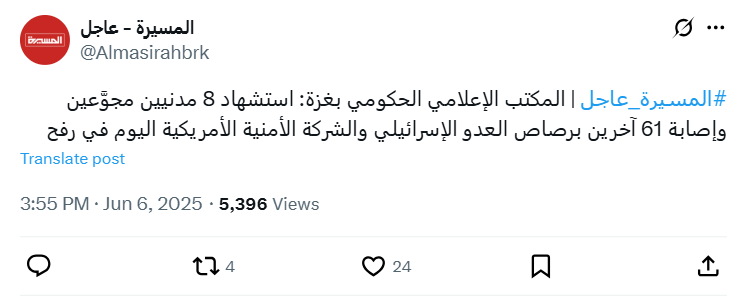 #المسيرة_عاجل | المكتب الإعلامي الحكومي بغزة: استشهاد 8 مدنيين مجوَّعين وإصابة 61 آخرين برصاص العدو الإسرائيلي والشركة الأمنية الأمريكية اليوم في رفح