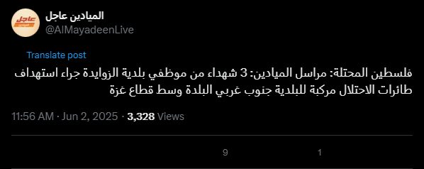 Occupied Palestine: Al-Mayadeen correspondent: Three Az-Zawaida municipality employees were martyred as a result of the occupation's aircraft targeting a municipal vehicle southwest of the town in the central Gaza Strip.