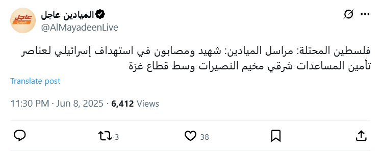 Occupied Palestine: Al-Mayadeen correspondent: One martyr and several wounded in an Israeli attack on aid workers east of the Nuseirat camp in the central Gaza Strip.