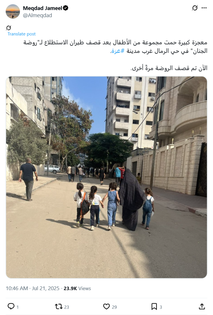 معجزة كبيرة حمت مجموعة من الأطفال بعد قصف طيران الاستطلاع لـ"روضة الجنان" في حي الرمال غرب مدينة #غزة.