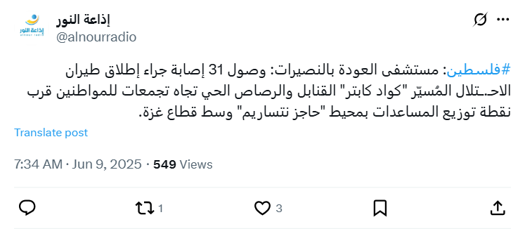 #Palestine: Al-Awda Hospital in Nuseirat: 31 injured people were admitted as a result of the occupation's "quadcopter" drones firing bombs and live bullets at civilian gatherings near the aid distribution point in the vicinity of the "Netzarim checkpoint" in the central Gaza Strip.