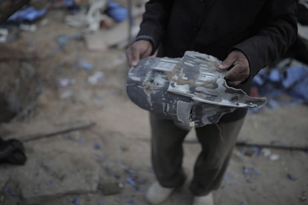 صورة شظية صاروخ استهدفت به قوات الاحتلال خيمة نازحين في ساحة مشفى شهداء الأقصى بدير البلح وسط قطاع غزة فجر اليوم.
