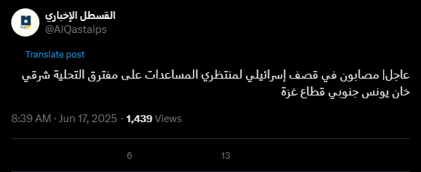 Urgent | Injuries in Israeli shelling of aid-pushing residents at the Tahlia Junction east of Khan Yunis in the southern Gaza Strip.