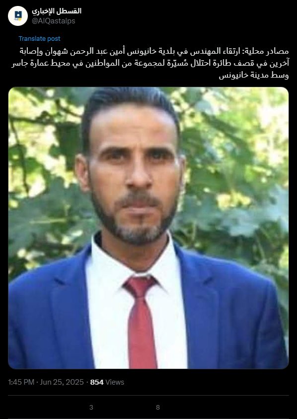 Local sources: Khan Yunis Municipality engineer Amin Abdul Rahman Shahwan was killed and others were injured in an Israeli drone strike on a group of citizens near the Jasser Building in central Khan Yunis.