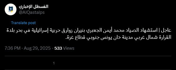Urgent | Fisherman Mohammed Ayman al-Ja'bari was killed by Israeli gunboat fire off the coast of al-Qarara town, northwest of Khan Yunis, in the southern Gaza Strip.