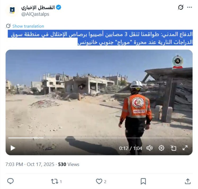 Civil Defense: Our crews transported 3 people injured by Israeli occupation forces in the motorcycle market area near the liberated "Moraj" area, south of Khan Yunis.